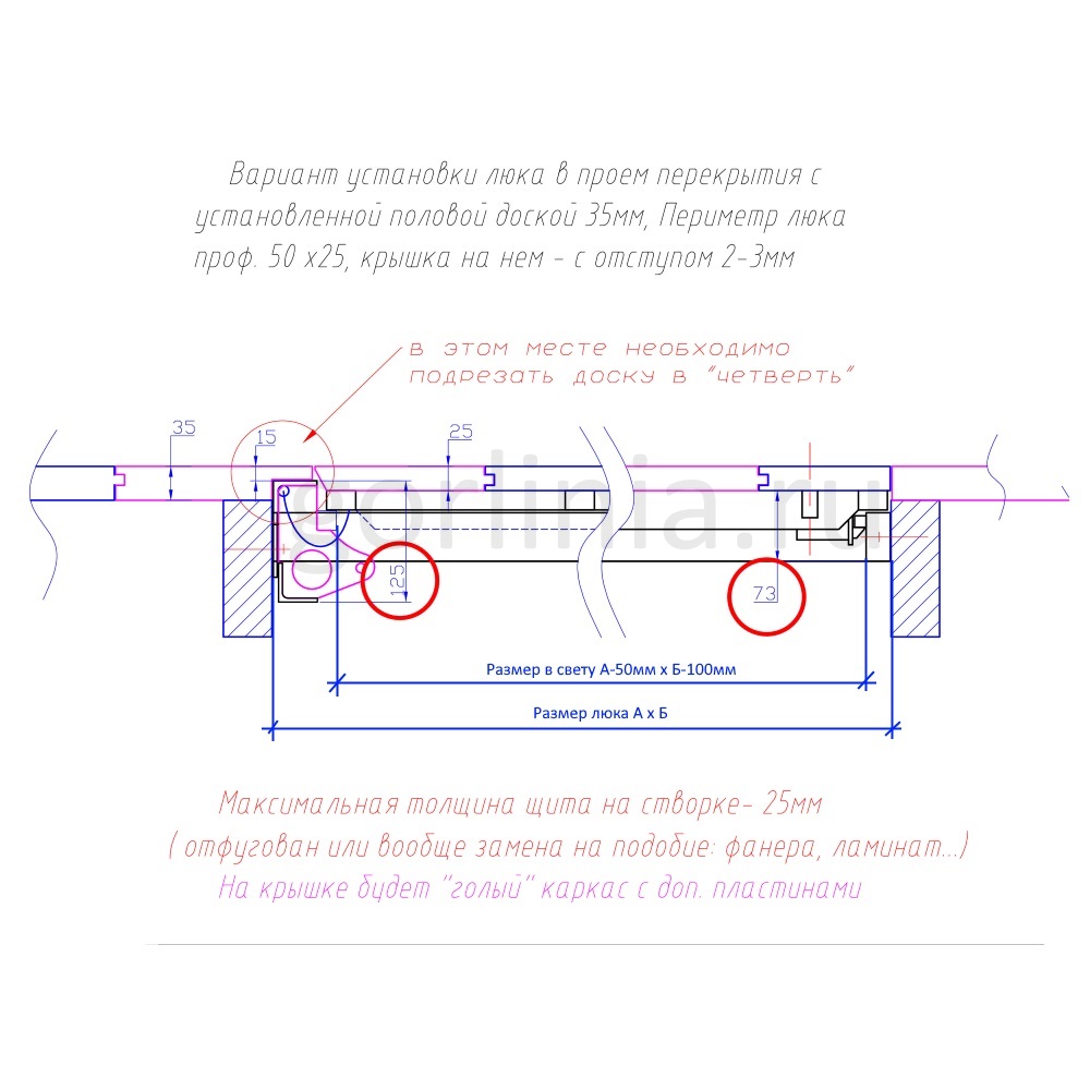 Скрытый короб из профиля 50х25 без наличников крепят на расчетную отметку над уровнем чистовых полов. Со стороны оси открывания на паразитку приходит деревянный пол до 35 мм с подрезкой в четверть 15 мм, отступом 4-6 мм от края полки по месту. Дверь обшивается доской 25 мм с запилом торца на угол, как на схеме, для свободного хода двери на газовых амортизаторах до угла распахивания 88° при зазоре 2-4 мм на петлевым узлом.