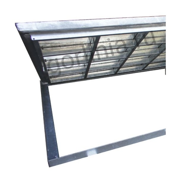 Рама сварена из сортового уголка 50х5. Каркас двери с видимым кантом выполнен с обвязкой из профиля 50х25 с ячейкой 300х300 в осях. Дно крышки закрыто оцинкованным листом 2 мм с расчетной глубиной 20 или 30 мм в зависимости от толщины доски декинга. Элемент петли реализован выносными разъемными шарнирами.