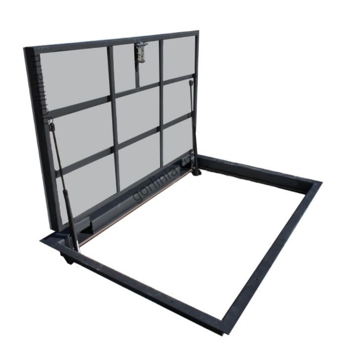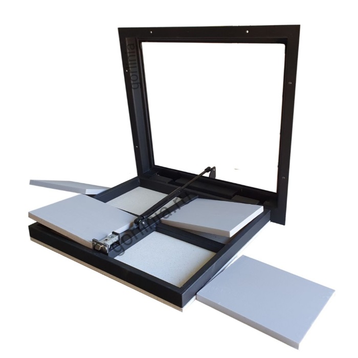 Облегченная рама из формованного листового проката 3 мм с наличником для установки в непроходных местах дома. Каркас крышки с обрешеткой сварен из трубы 30х20, обшит ГВЛ над утеплителем в уровень нулевой отметки пола под чистовую отделку плиткой.