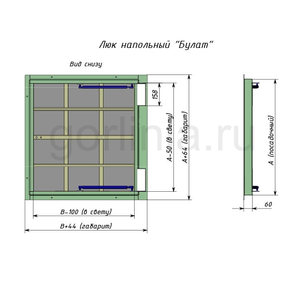 Облегченная модель без щелей в полу со смещенными за ось открывания петлями. Петлевая сторона по меньшему размеру 500 с плечевой 600 образует удобный лаз 450*500. Легкая ходовая часть и удобный монтаж. При формировании напольного отверстия обратите внимание на защитные кожухи шарниров. Коробки выходят за посадочную отметку по плечевой стороне.